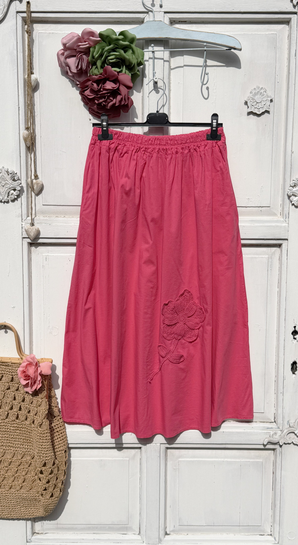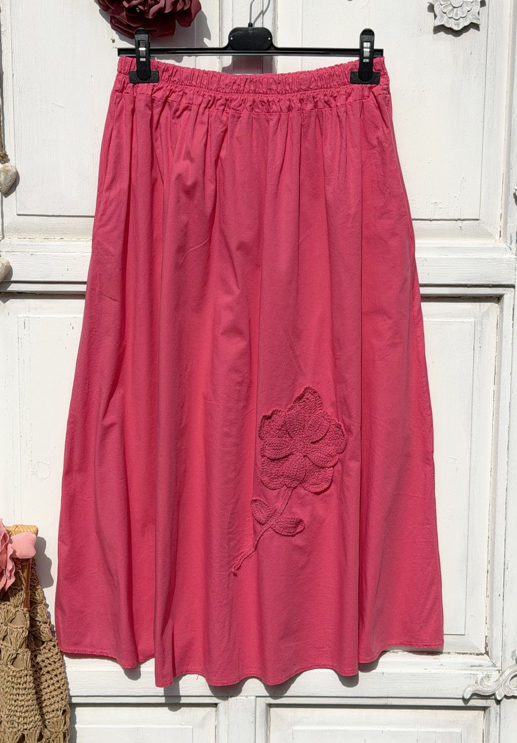 Olasz, A vonalú, rávarrt horgolt virágos, zsebes ciklámen szoknya:))