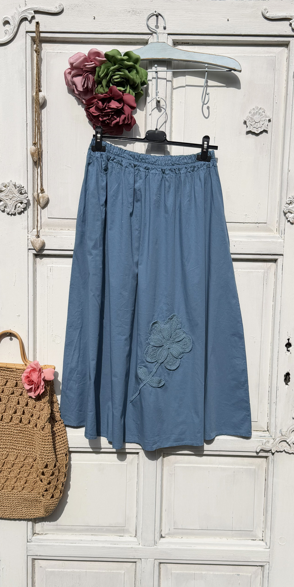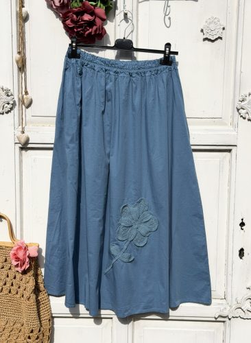 Olasz, A vonalú, rávarrt horgolt virágos, zsebes kék szoknya:))
