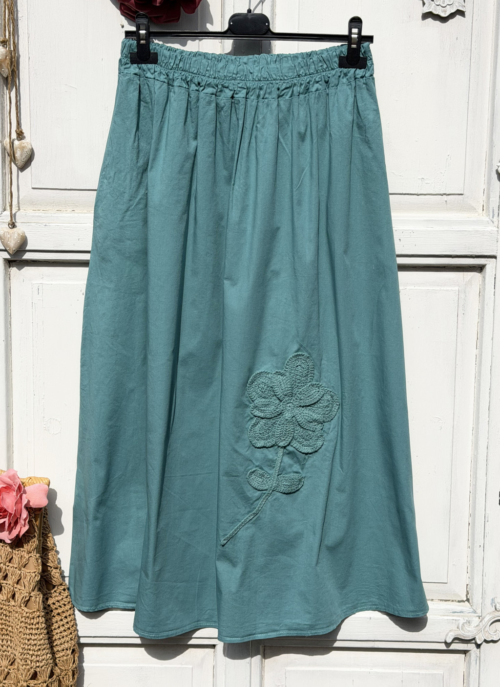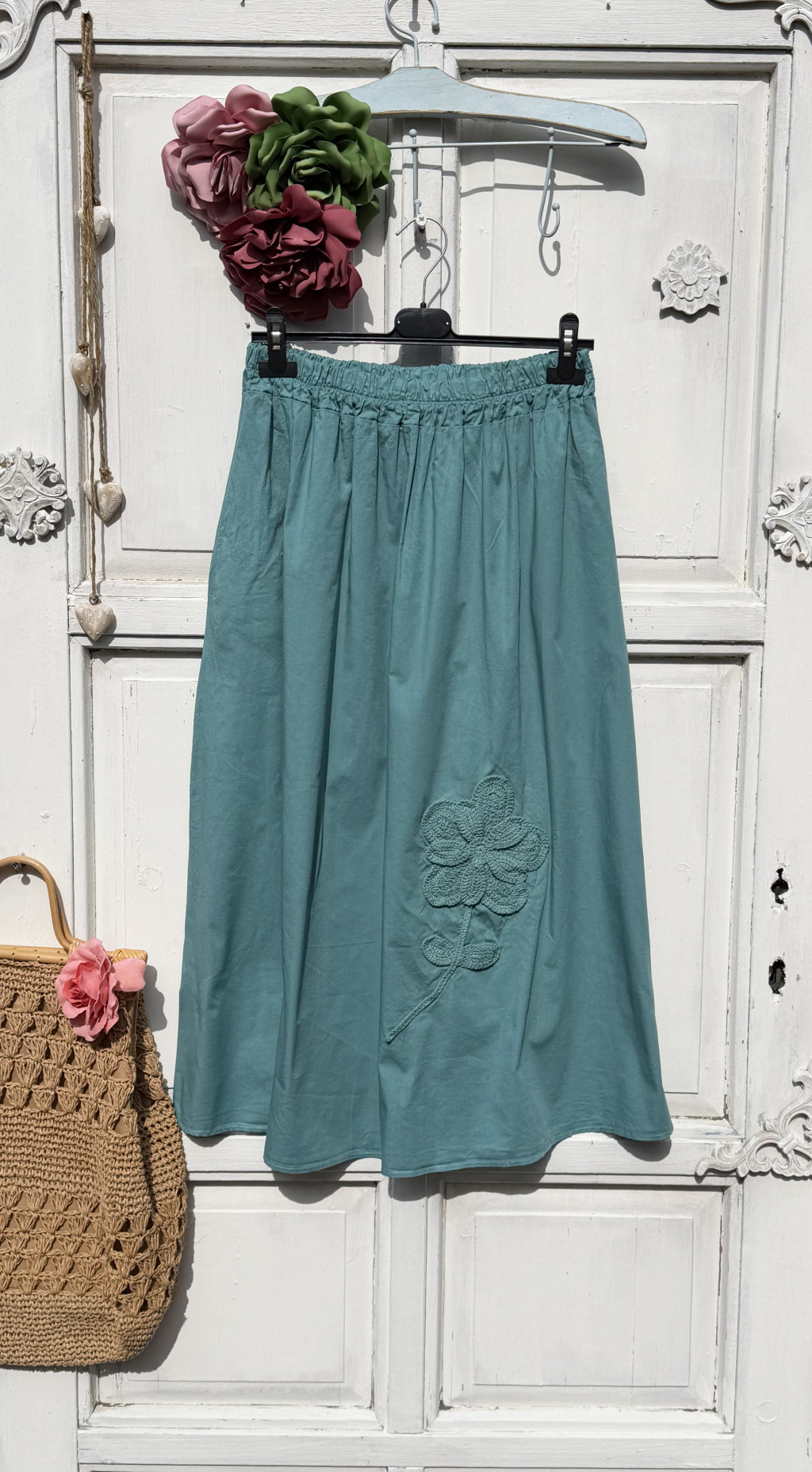 Olasz, A vonalú, rávarrt horgolt virágos, zsebes menta szoknya:))