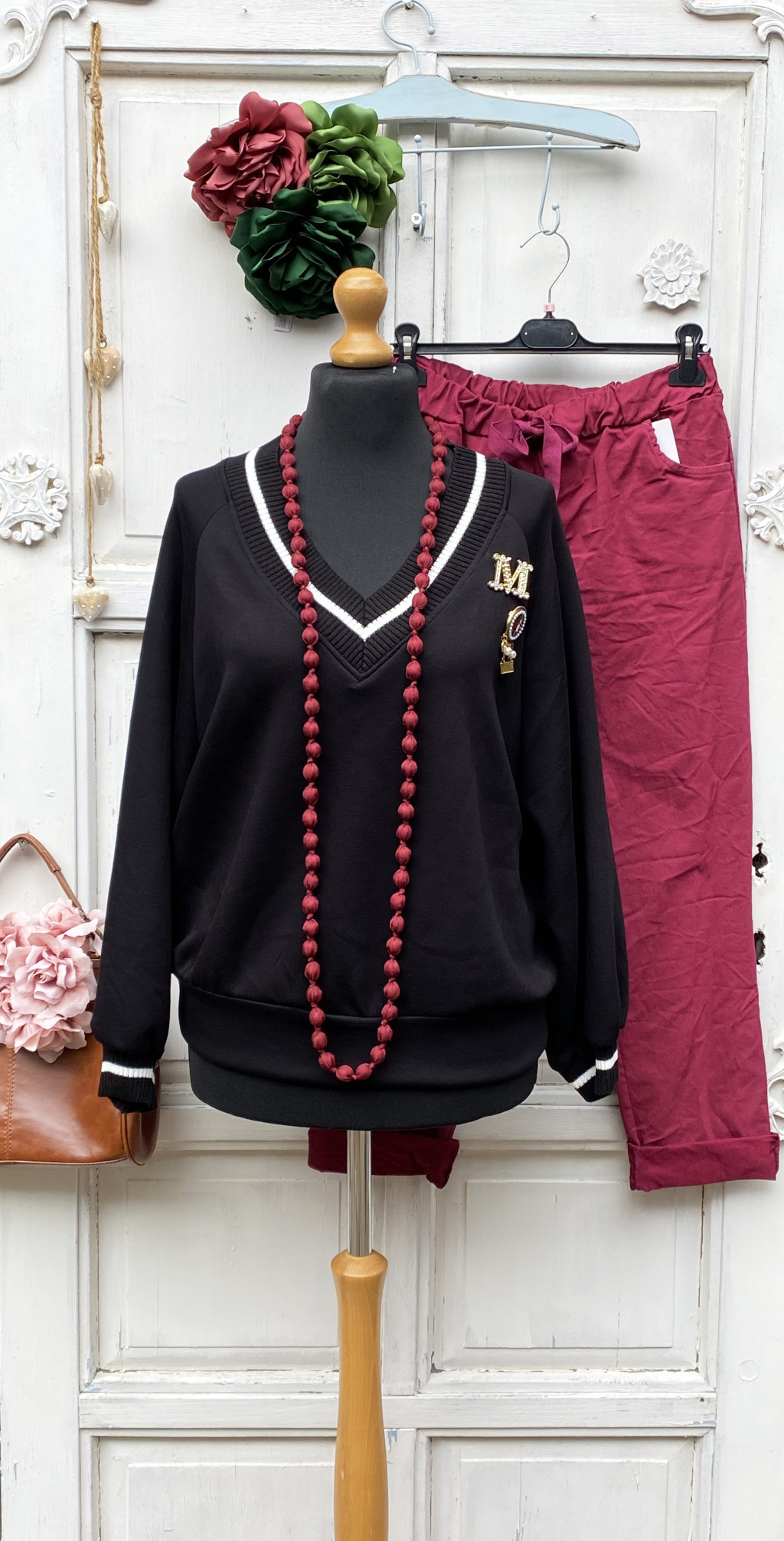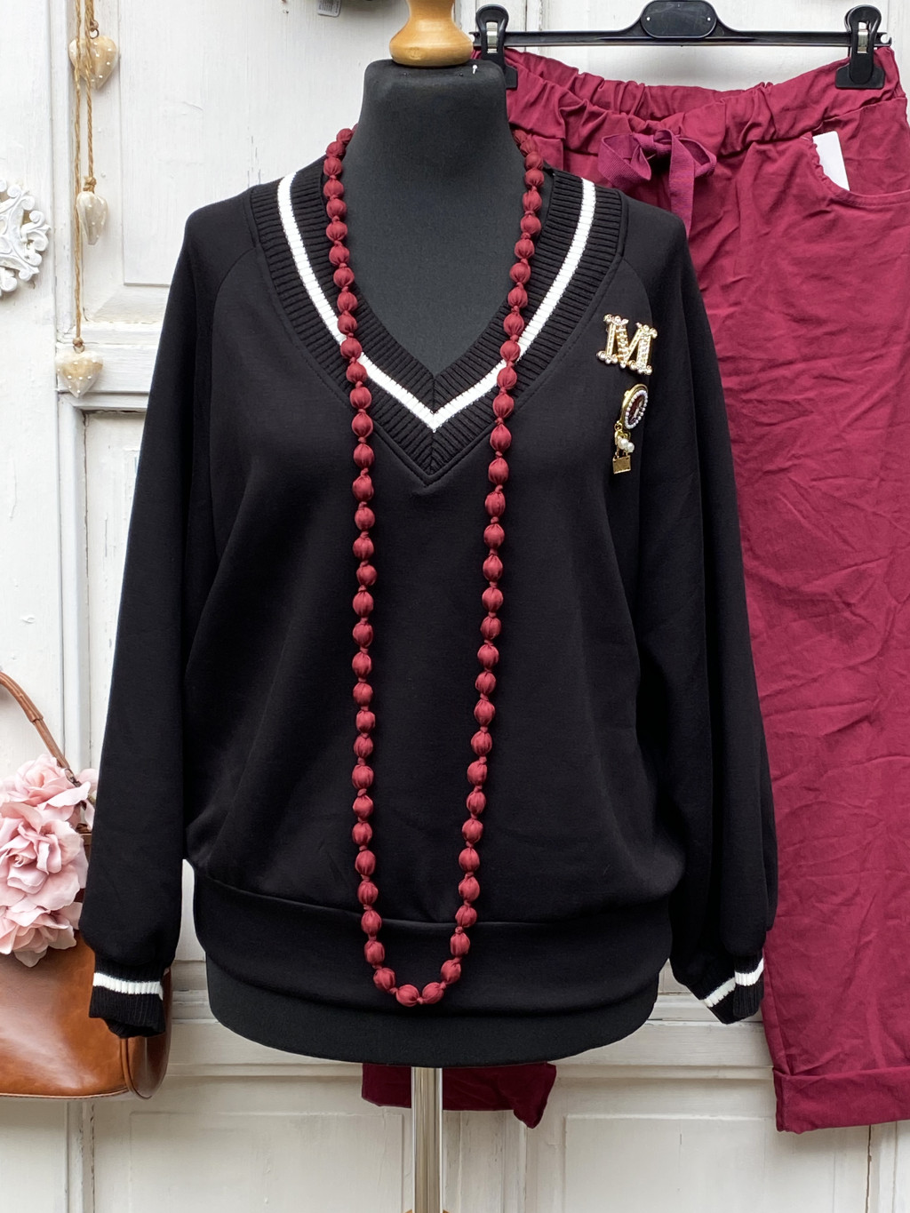 Olasz, V nyakú csíkos passzés fekete felső, kitűzőkkel:))