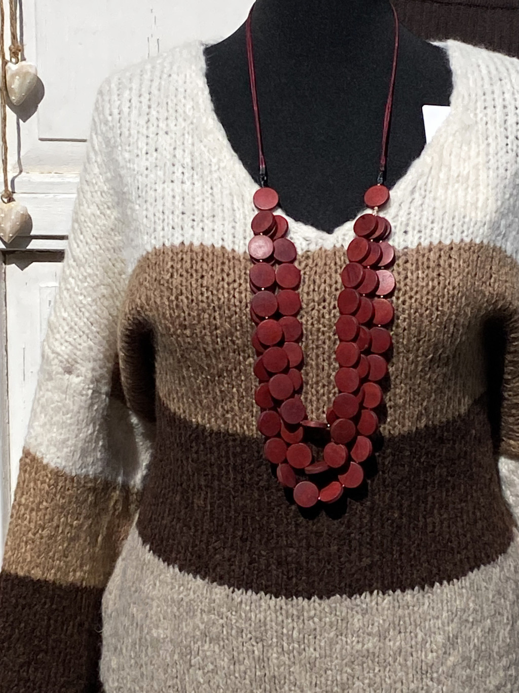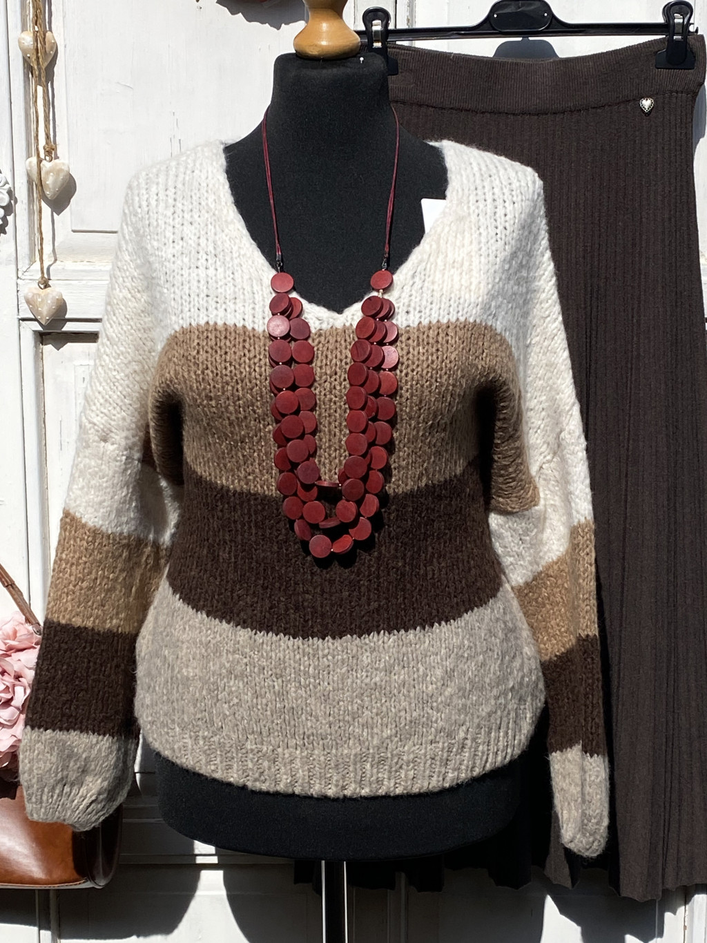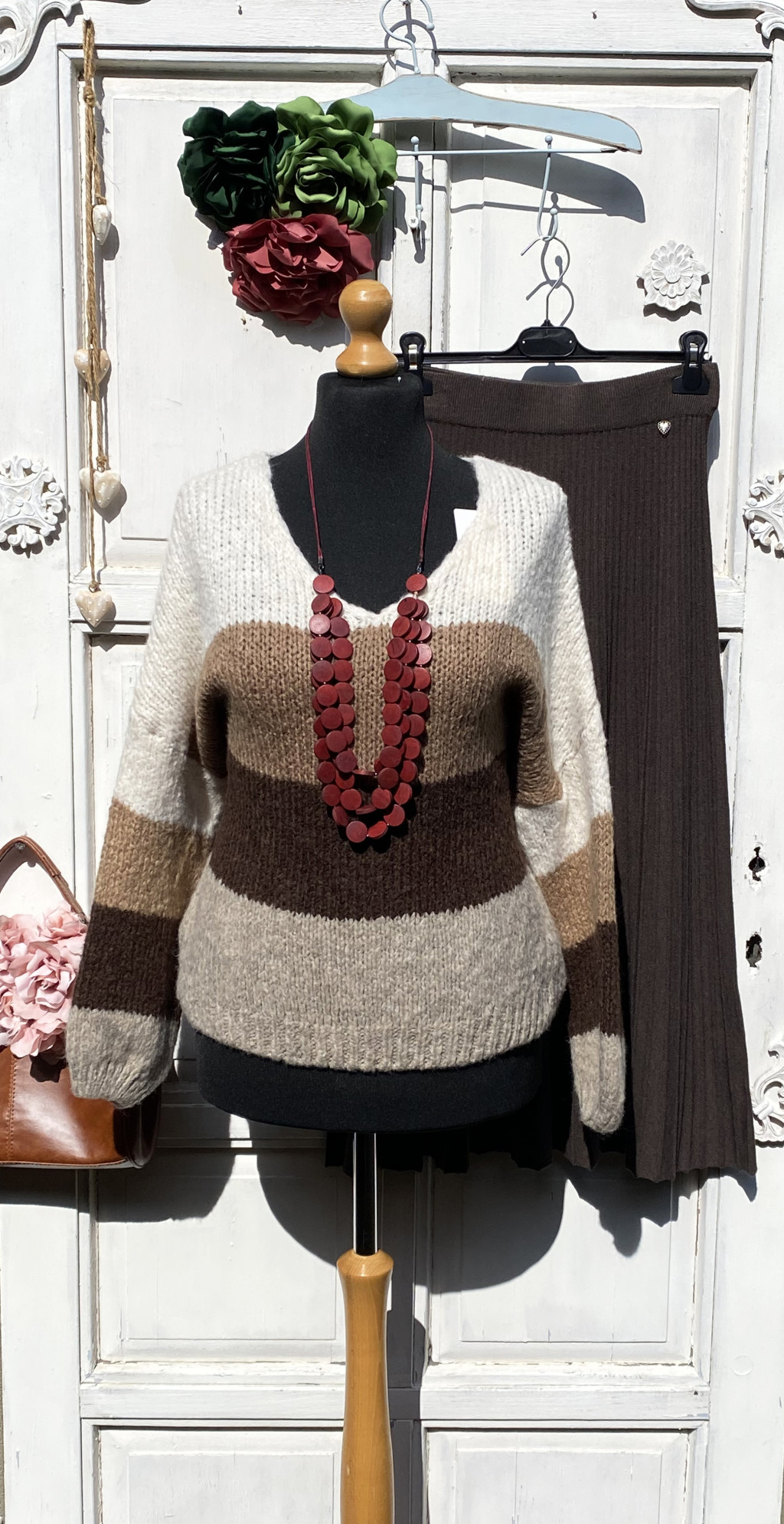 Olasz, V nyakú kötött csíkos pulcsi, barna/bézs/karamell alappal:))