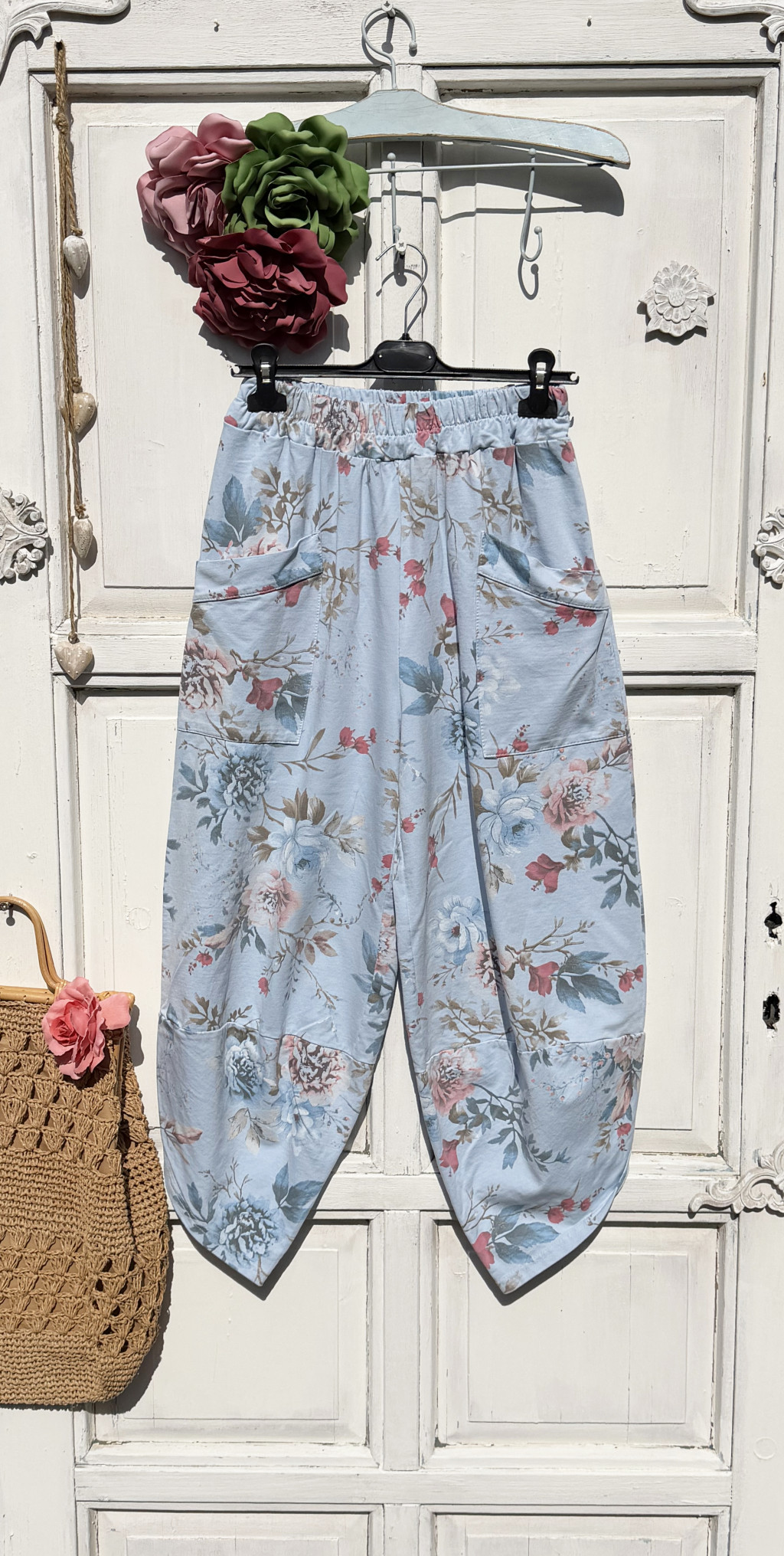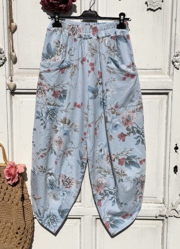 Olasz, alján ívelt, elején nagy zsebes virágos nadrág, kék alappal:))