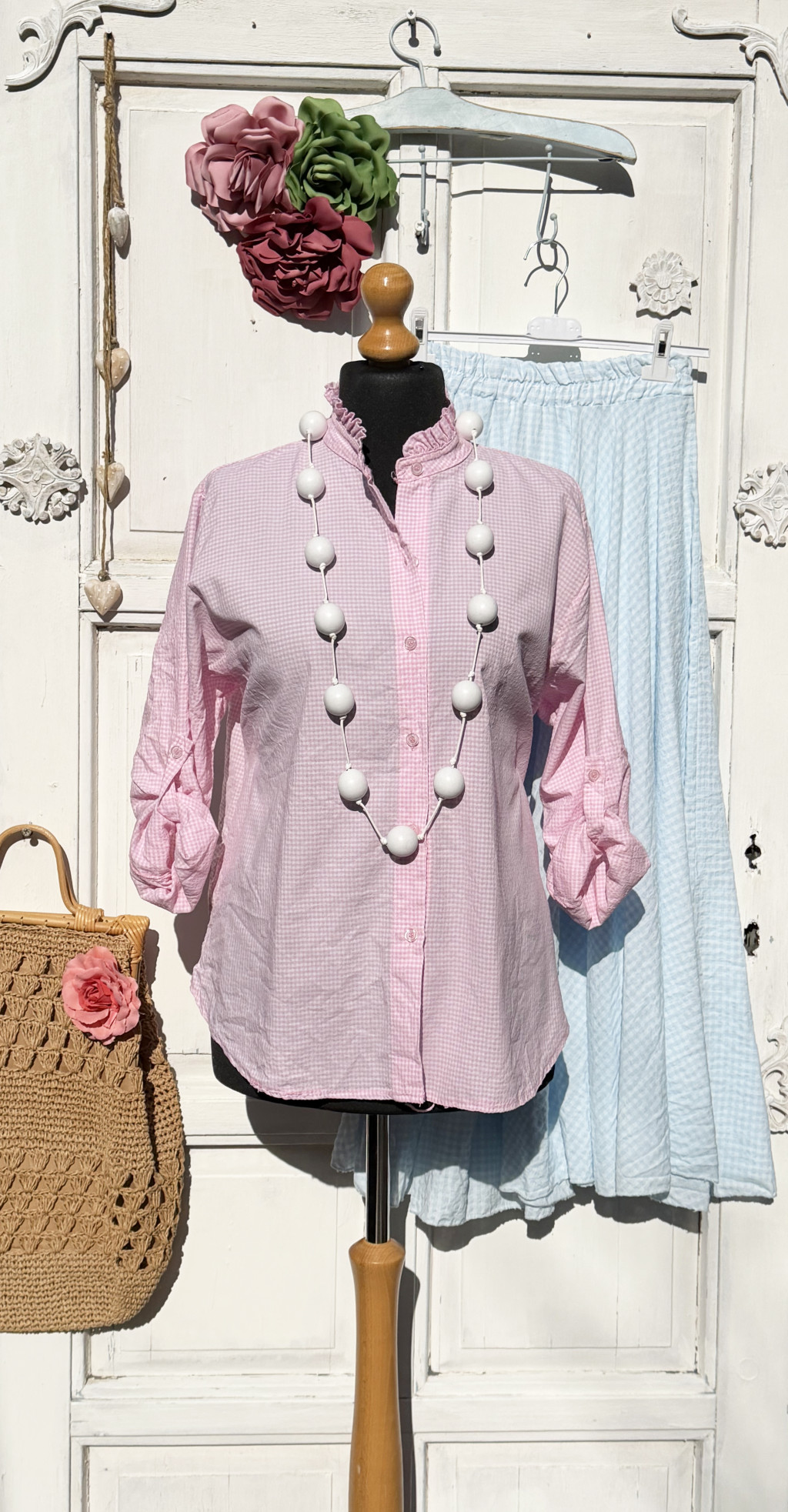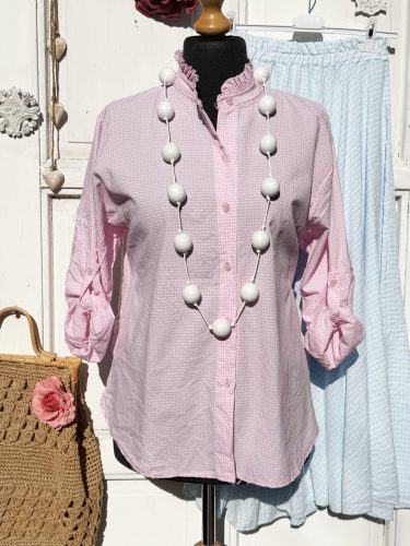 Olasz, apró kockás, fodros nyakú blúz, rózsaszín/fehér alappal:))