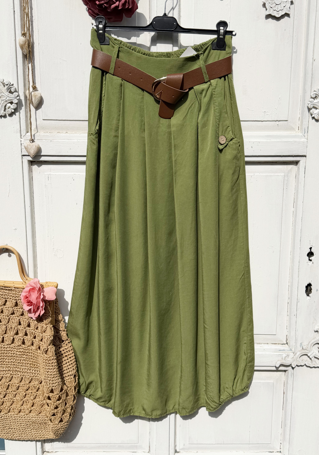 Olasz, elején gombos/zsebes szoknya, zöld színben, ajándék övvel:))
