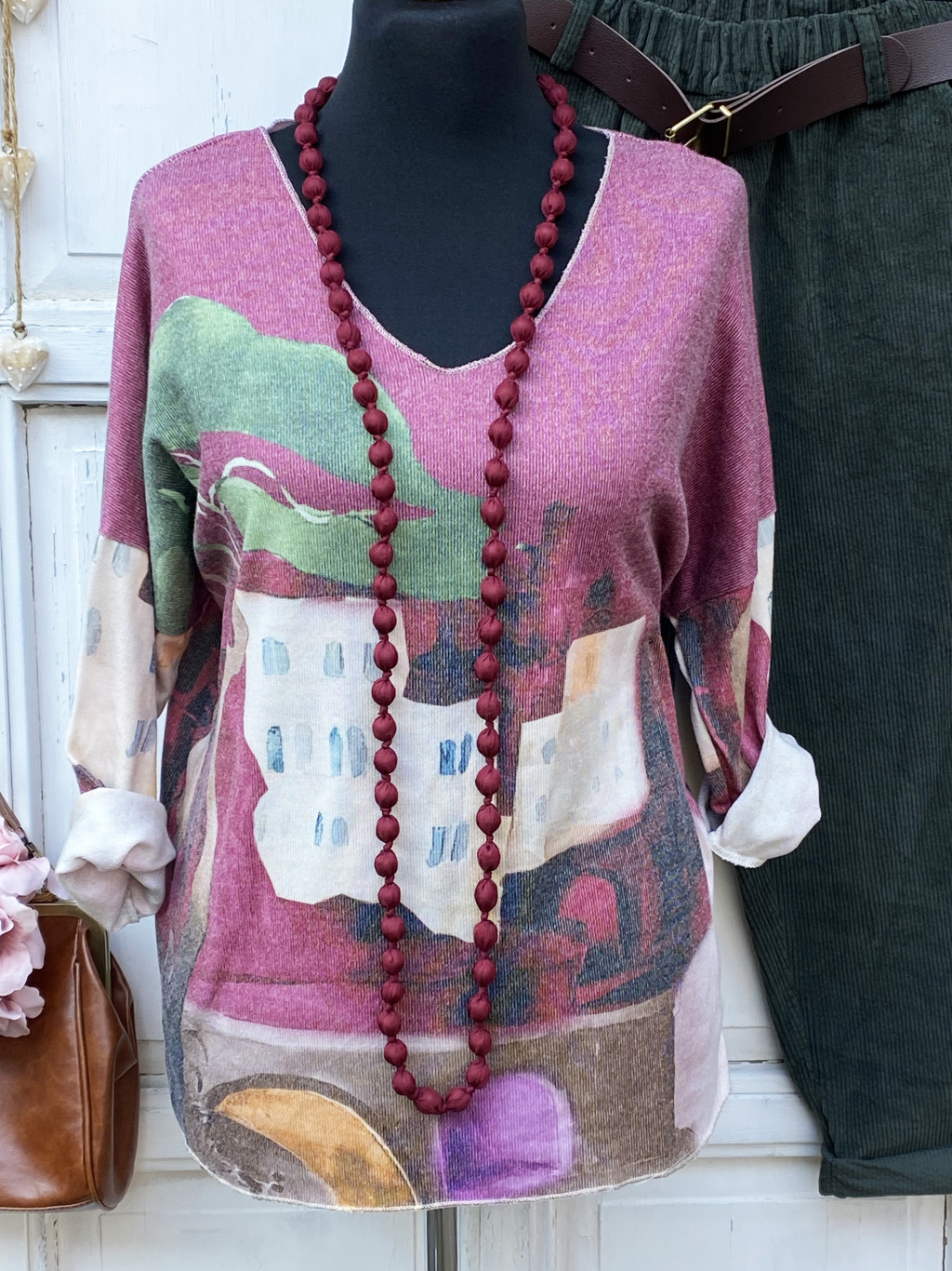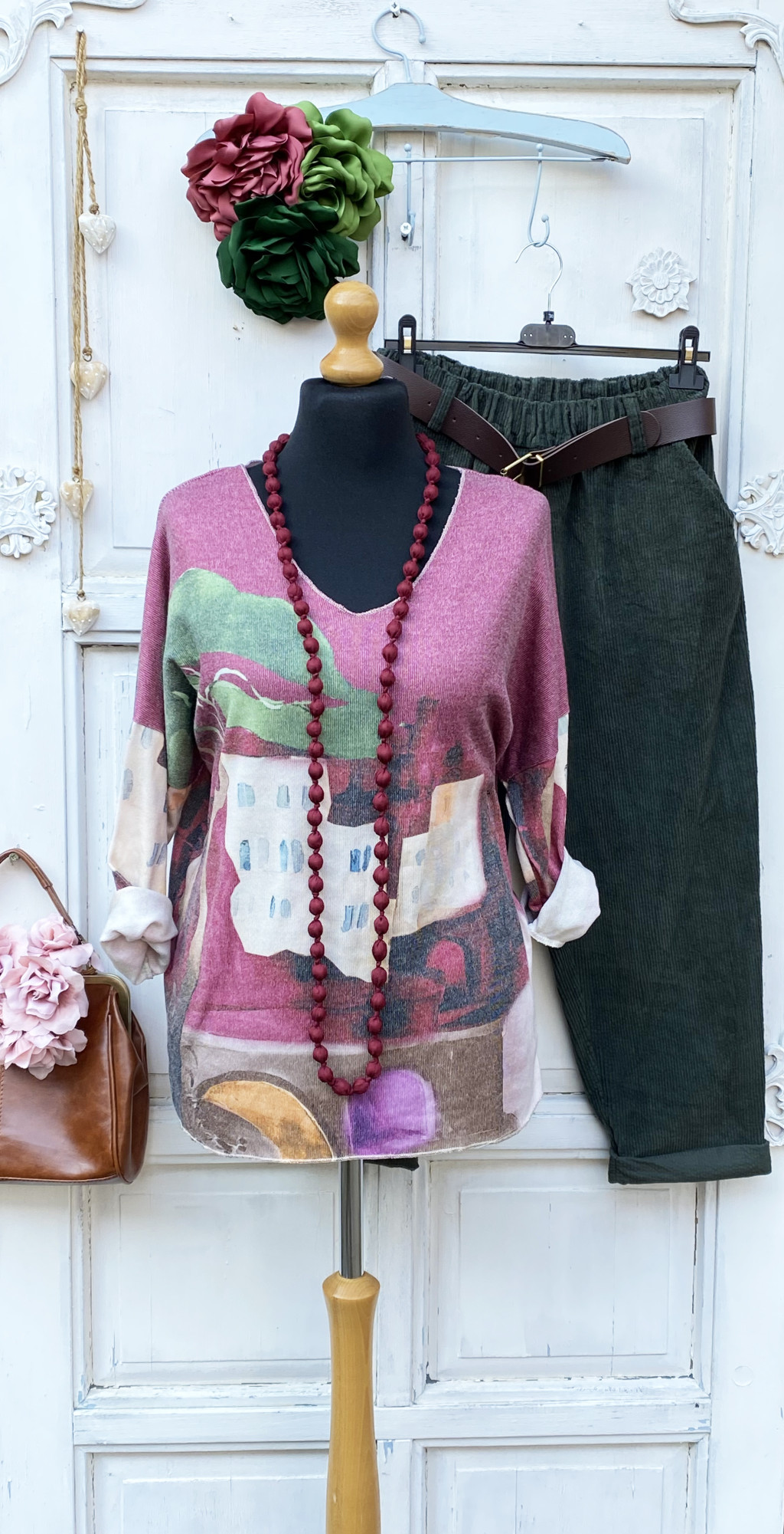 Olasz, finom kötött, V nyakú színes, vidám felső:))
