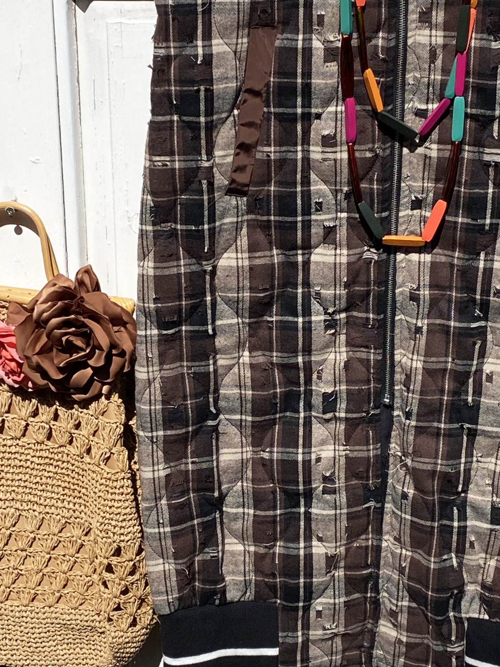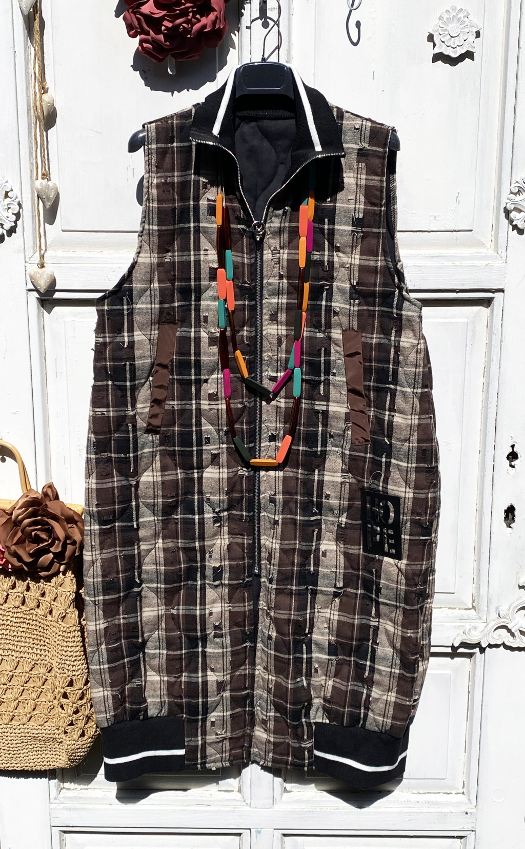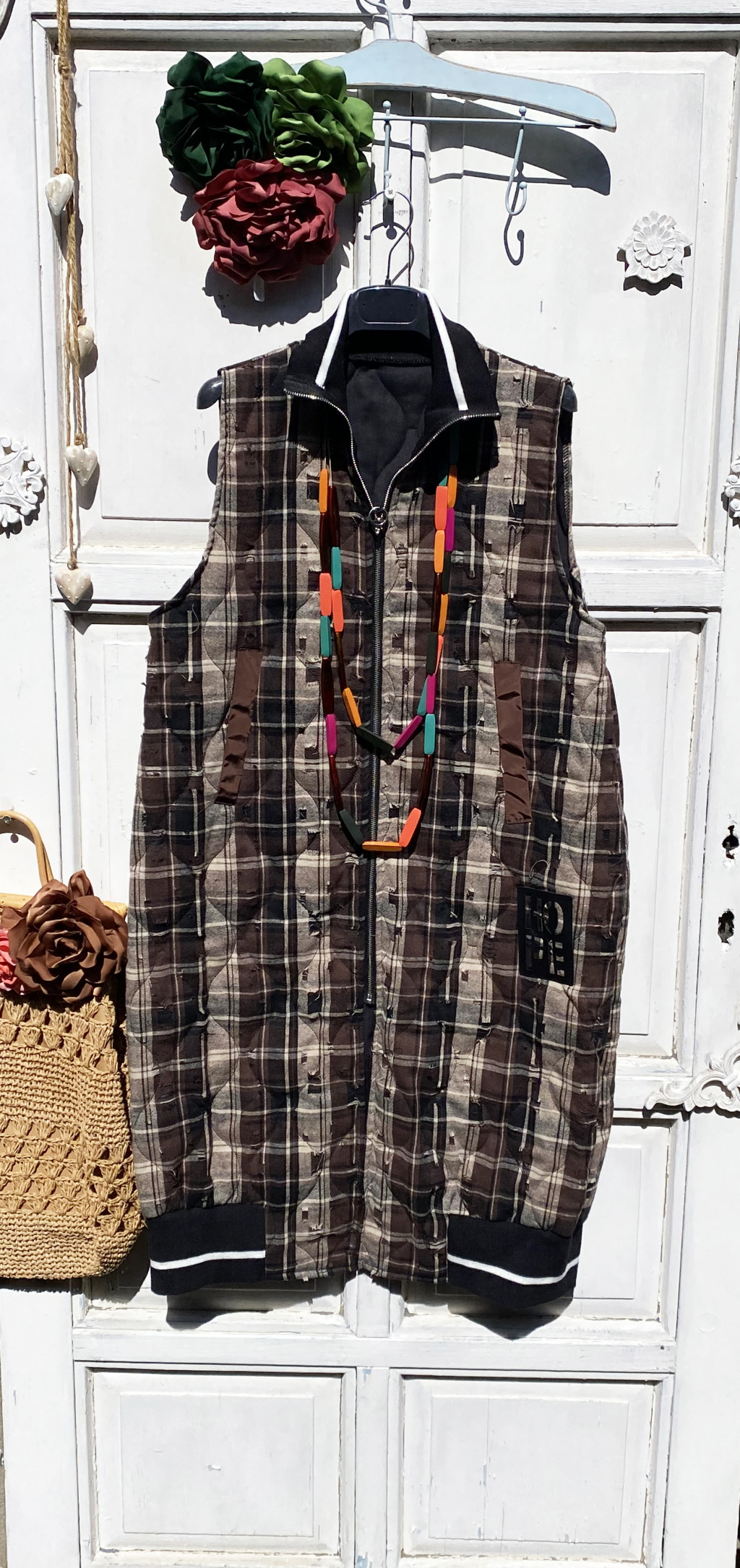 Olasz, igen extra anyagú, steppelt, zsebes, passzés hosszított kockás mellény, barna alappal:))
