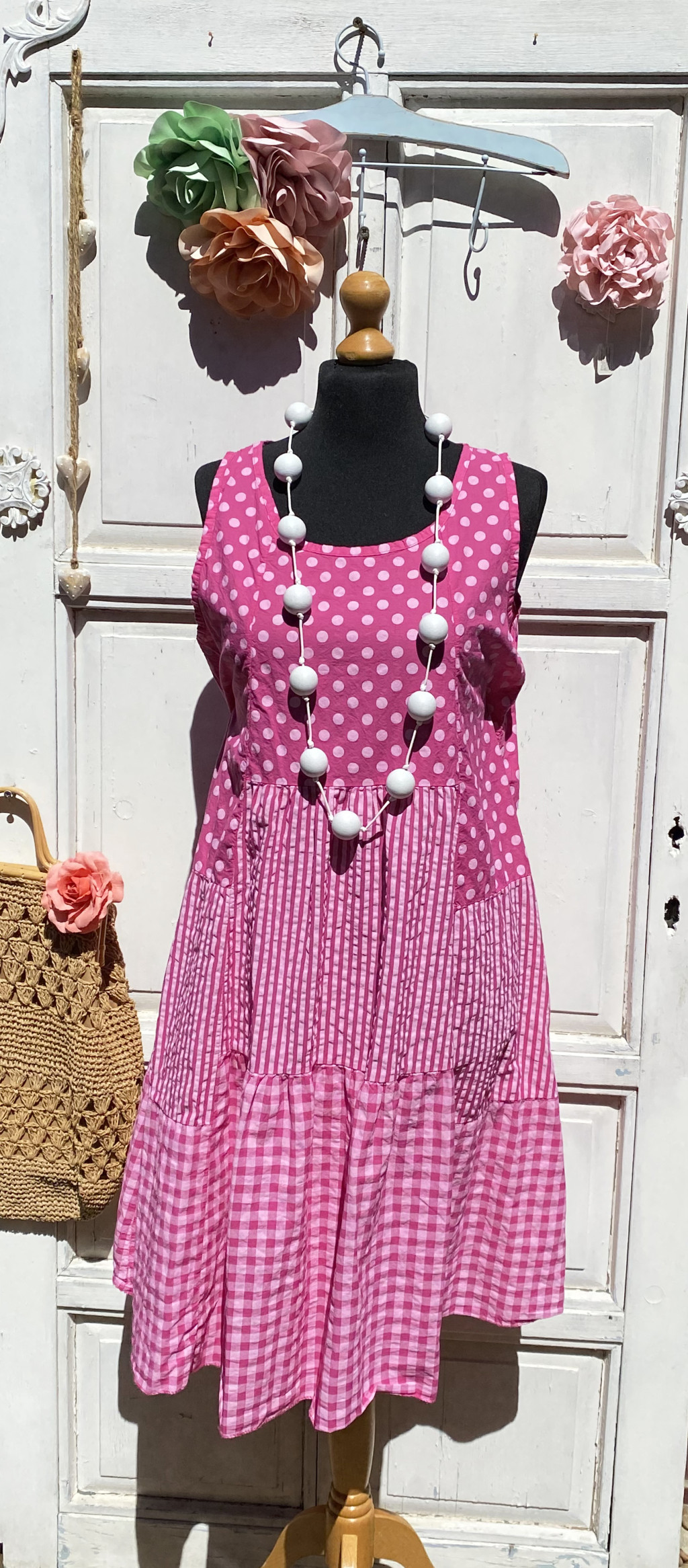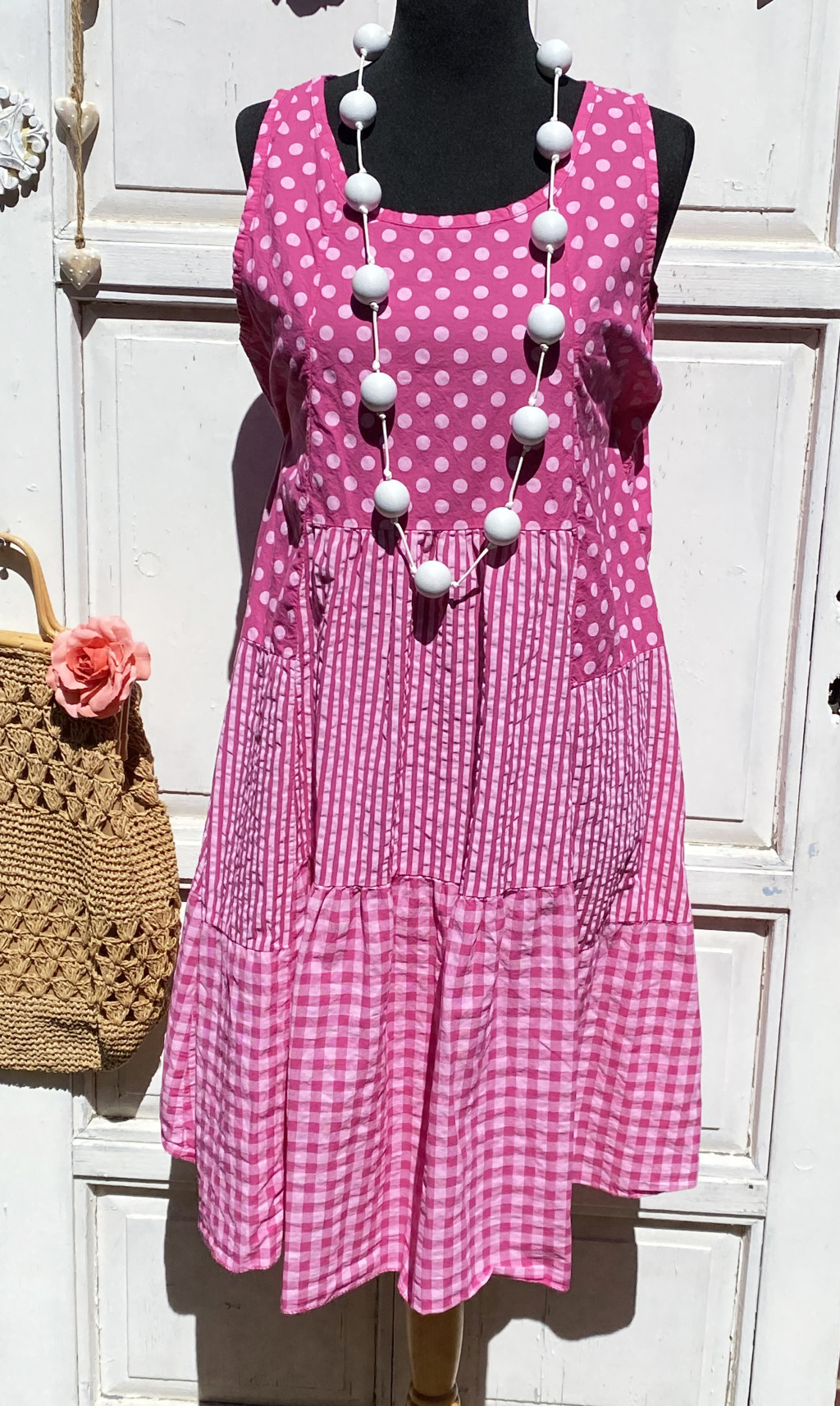 Olasz, kockás/pöttyös/csíkos nyári ruha, ciklámen alappal, némi fodorral:))