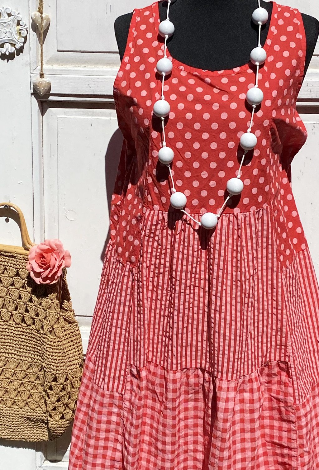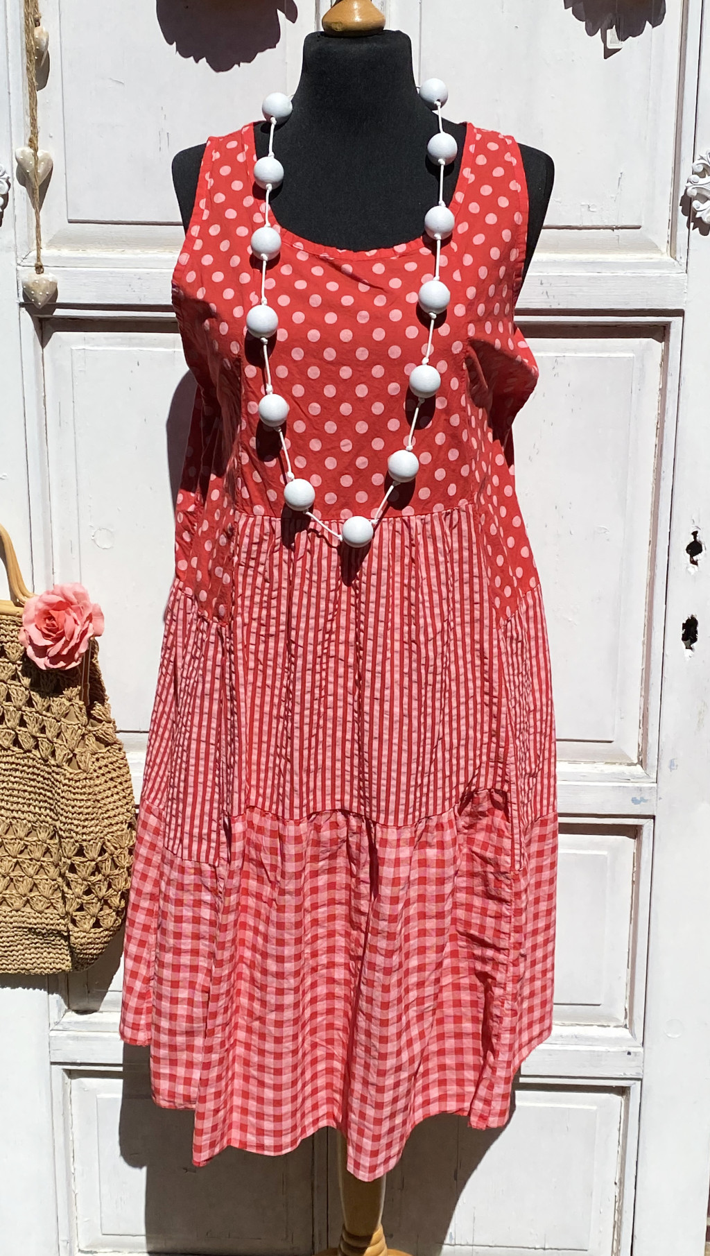 Olasz, kockás/pöttyös/csíkos nyári ruha, piros alappal, némi fodorral:))