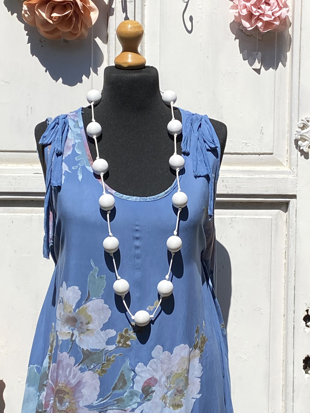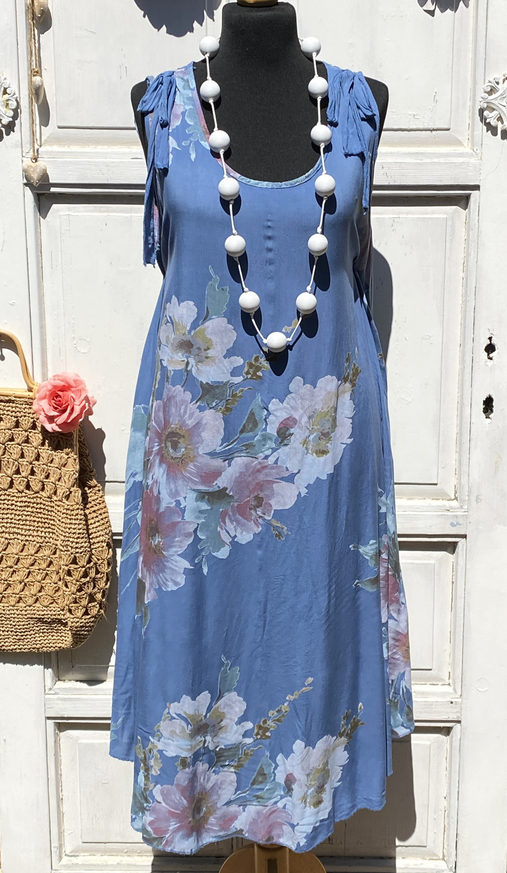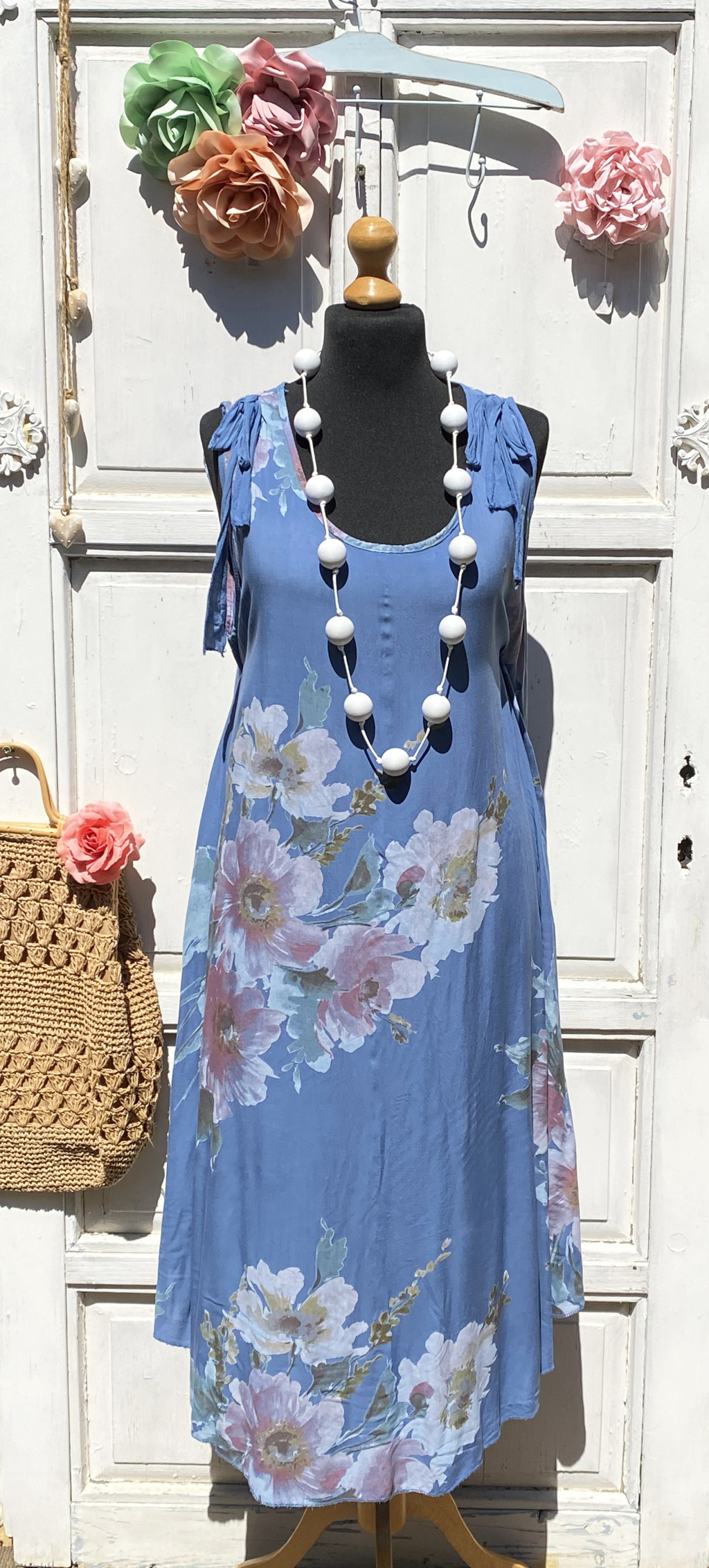 Olasz, vállán masnis, pasztell virágos ruha, kék alappal, zsebekkel:))